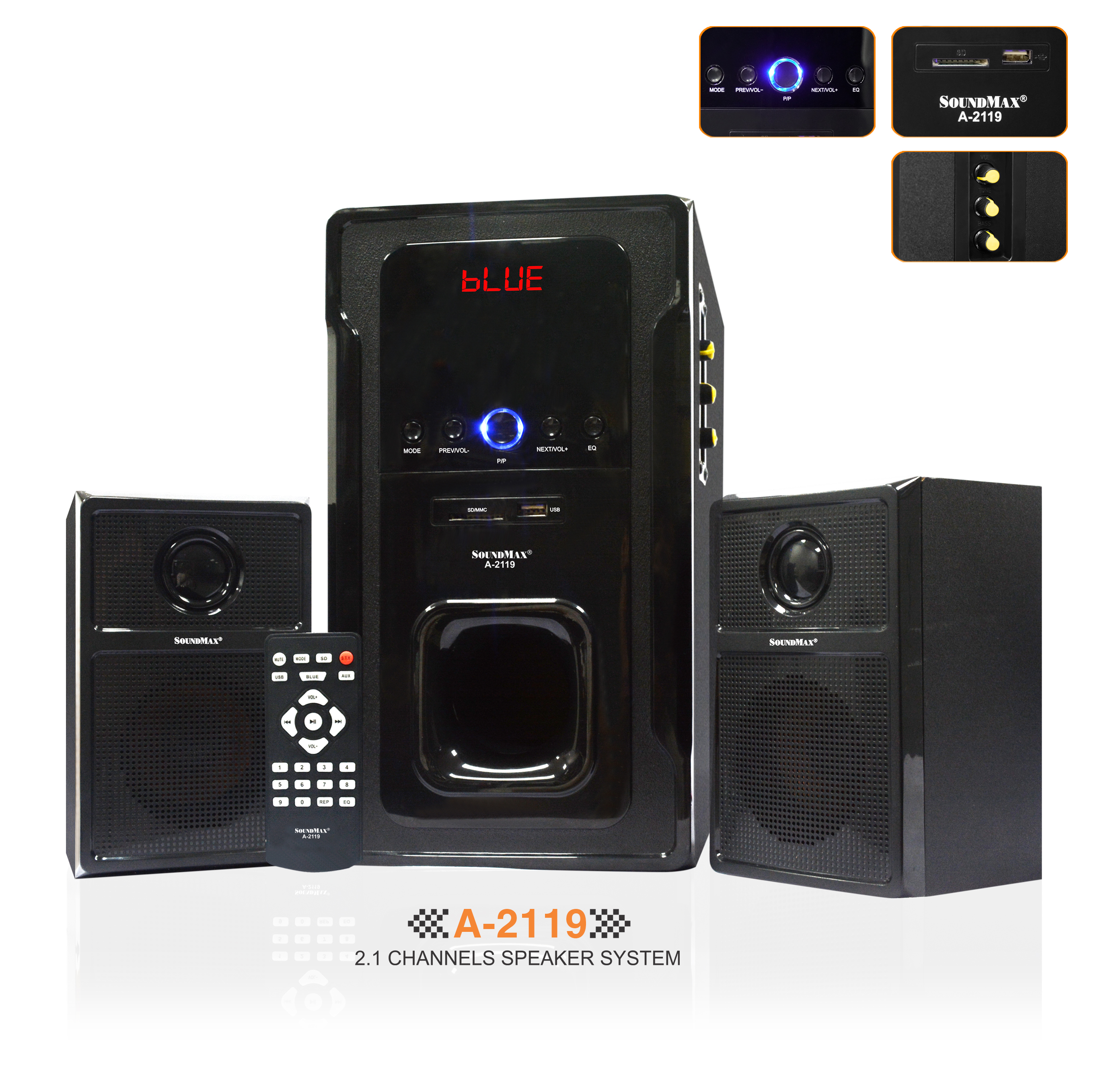 SoundMax A-2119 là dòng loa 2.1 kênh. Bạn sử dụng cho nghe nhạc, xem phim, hay chơi game. Loa có trang bị ngõ vào AUX USB/SD với dung lượng lên đến 16GB, hỗ trợ kết nối bluetooth và ngày càng đáp ứng tốt nhu cầu nghe nhạc, xem phim hay chơi game, hỗ trợ định dạng MP3/WMA/WAV. Ngoài ra loa còn có chức năng điểu khiển từ xa với remote kèm theo.