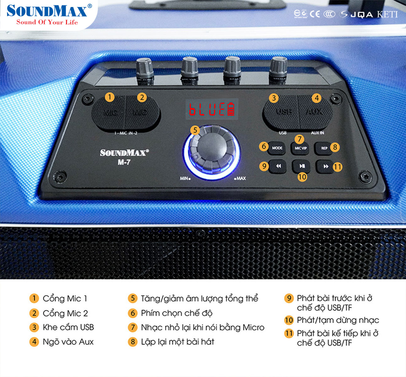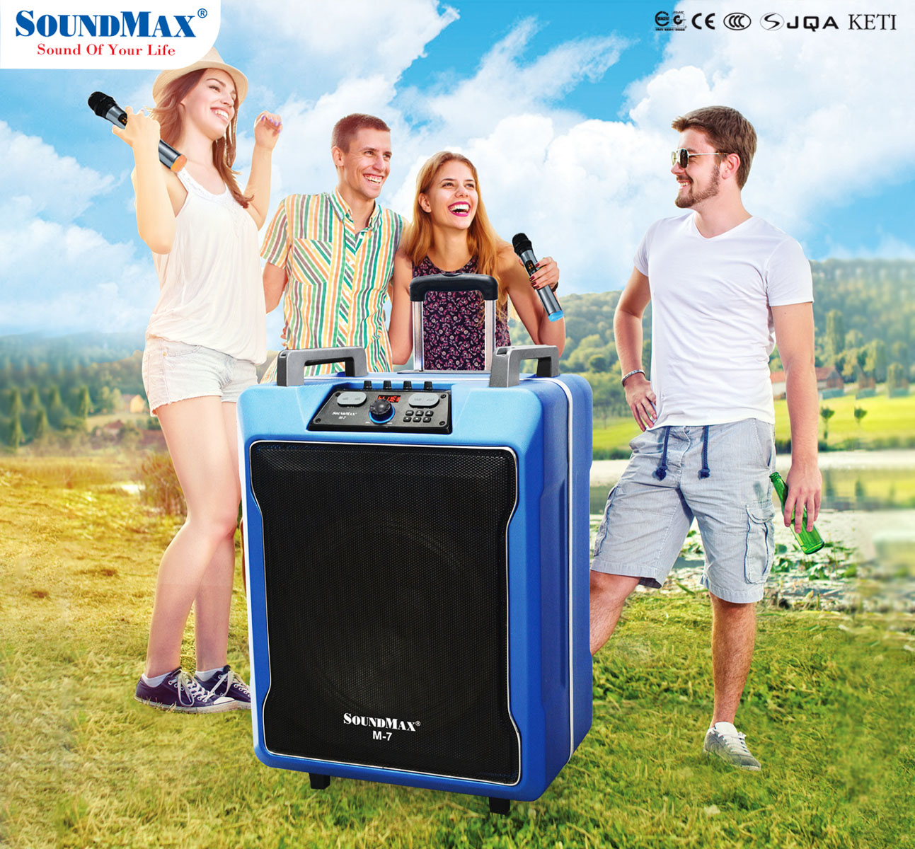 SoundMax M-7 là mẫu loa có thiết kế mạnh mẽ một chiếc vali kéo lớn hướng đến những khách hàng cần một bộ loa đa năng, có thể di chuyển dễ dàng và quan trọng là có thể cùng hát thỏa thích với nhau trong những những chuyến du lịch, team building, lễ lộc, sum họp gia đình, bạn bè.