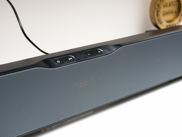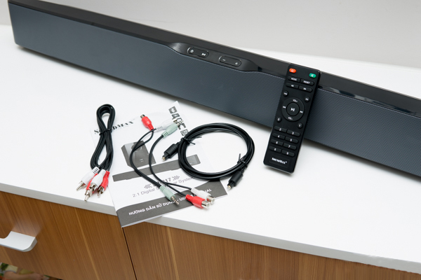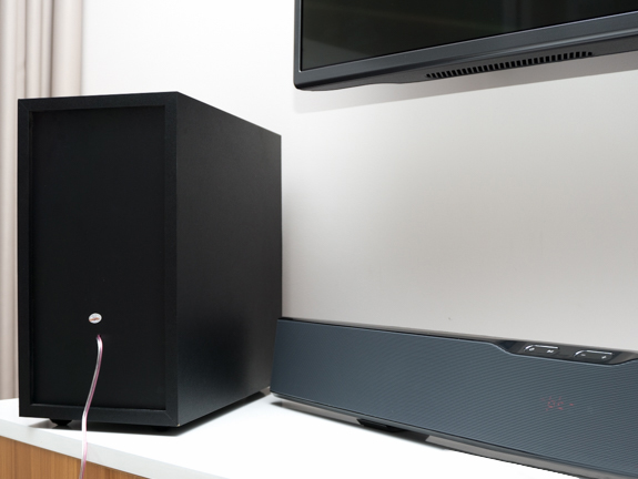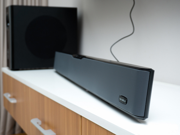 Low weight with 2.6 kilogram covered by an aluminium layer protecting 4 front drivers, audio input switches on the back of the soundbar and it can be wall-mouted. Rectangular design with steam pipe on the front of the subwoofer, connecting to the soundbar by an all-in-one signal wire.