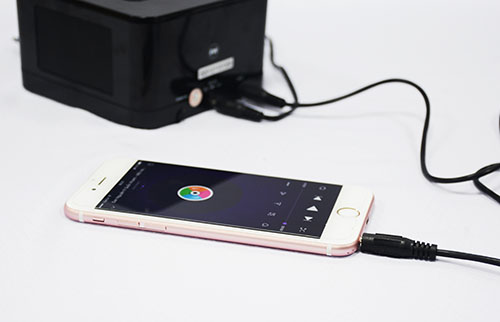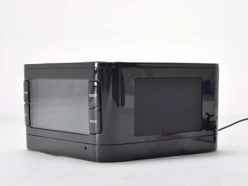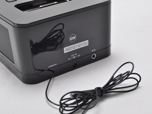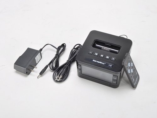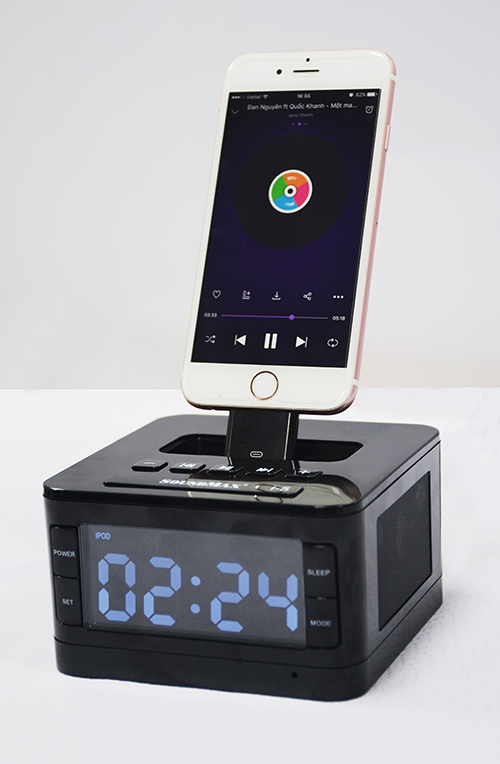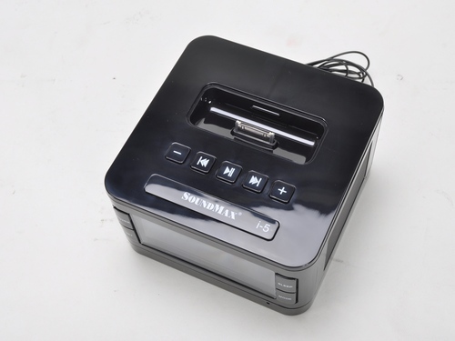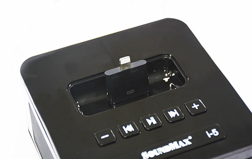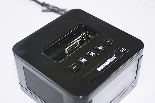 Underneath of glossy black unibody embeded in a lightweight design (112 x 110.5 x 64mm, weight 350g), two-sided 1.5 inch drivers transmit a 360 degree voice. SoundMax i-5 has a range of attractive features such as FM, speaker on / off, alarm, charging dock for iPhone, iPad. The device uses 5V DC power supply with the adapter included. Users can also connect speakers with audio sources via 3.5mm output.
