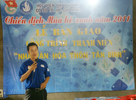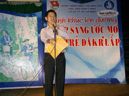 Anh Nguyễn Nguyên Bảo Thắng phát biểu tặng Nhà văn hóa cho thôn Tân Bình, xã Dăk Ru Đăk R’Lâp, tỉnh Đăk Nông.