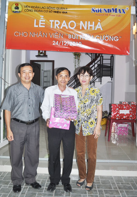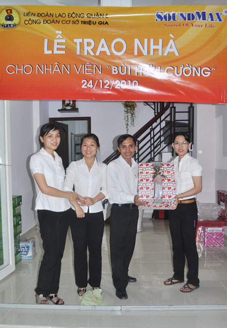 Đại diện Ban Chấp Hàng Công Đoàn công ty SOUNDMAX, ông Nguyễn Nguyên Bảo Thắng ( Chủ Tịch Công Đoàn) rất hoan nghênh và chúc mừng anh Bùi Hữu Cường được trao tặng một căn nhà khang trang để anh ổn định cuộc sống và tiếp tục cống hiến nhiều hơn nữa cho sự phát triển lâu dài của công ty trong tương lai. Đồng thời gửi lời Cảm ơn chân thành đến Giám Đốc và Ban Giám Đốc đã quan tâm đến đời sống , sự cống hiến của CB-CNV bằng việc ghi nhận và khen thưởng hết sức thiết thực. Ông Nguyễn Nguyên Bảo Thắng phát biểu: “ Với việc trao tặng căn nhà rất đẹp như thế này, Tôi mong rằng trong tương lai sẽ có nhiều anh chị CB-CNV nữa trong công ty chúng ta sẽ sở hữu một căn nhà như anh Cường”